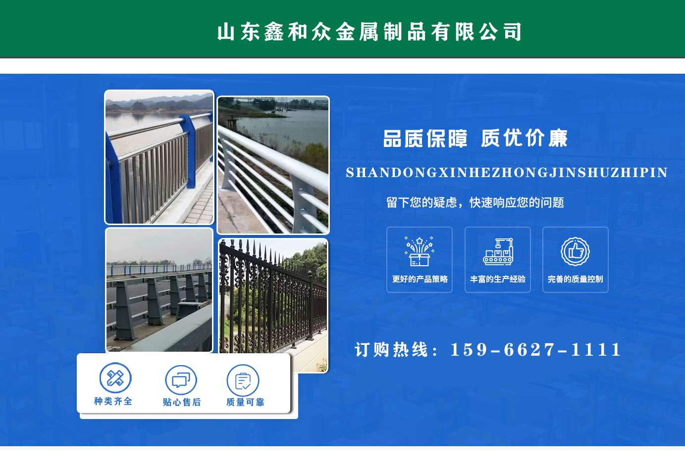 山東鑫和眾金屬制品有限公司主要產(chǎn)品有防撞護(hù)欄,橋梁護(hù)欄,道路護(hù)欄,河道護(hù)欄,不銹鋼護(hù)欄等護(hù)欄。提供設(shè)計(jì)方案,一站式定制,包您滿(mǎn)意價(jià)格優(yōu)惠,歡迎來(lái)電咨詢(xún)! 公司常年從事銷(xiāo)售護(hù)欄防撞護(hù)欄,橋梁護(hù)欄,道路護(hù)欄,河道護(hù)欄,不銹鋼護(hù)欄,橋梁鋼護(hù)欄,河道燈光護(hù)欄等。產(chǎn)品廣泛應(yīng)用于橋梁、河道、旅游景區(qū)、道路、公路、公園、小區(qū)、景觀、道路防撞等領(lǐng)域。 公司產(chǎn)品均采用優(yōu)質(zhì)不銹鋼材料,符合相關(guān)標(biāo)準(zhǔn)。各種型號(hào)不銹鋼復(fù)合管及護(hù)欄,質(zhì)量嚴(yán)格把控。產(chǎn)品強(qiáng)度高、耐腐蝕、焊接牢固、抗沖擊、性能好,防撞護(hù)欄結(jié)構(gòu)簡(jiǎn)單、美觀實(shí)用大方。 歡迎前來(lái)訂購(gòu)!...